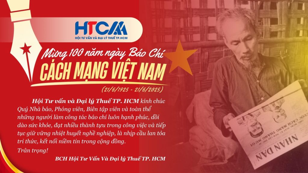 Hội Tư vấn và Đại lý Thuế TP. HCM (HTCAA) xin gửi lời tri ân sâu sắc đến Quý nhà báo, biên tập viên, phóng viên, những người đã và đang cống hiến thầm lặng cho sự nghiệp báo chí. Nhân kỷ niệm 100 năm Ngày Báo chí Cách mạng Việt Nam (21/06/1925 – 21/06/2025) thay mặt toàn thể Hội viên HTCAA kính chúc Quý anh chị sức khỏe, bản lĩnh và luôn giữ vững ngọn lửa yêu nghề, để mỗi trang viết tiếp tục là cầu nối của niềm tin, sự thật và tri thức.