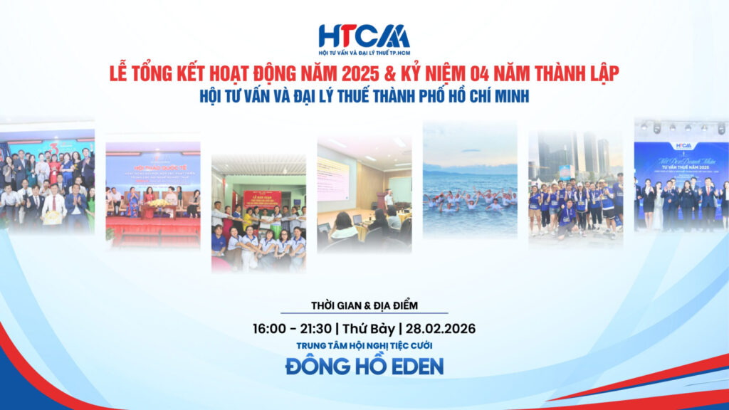 Trải qua 4 năm hình thành và phát triển (22/02/2022 – 22/02/2026), Hội Tư Vấn Và Đại Lý Thuế Thành phố Hồ Chí Minh (HTCAA) đã không ngừng khẳng định vai trò là cầu nối vững chắc giữa cơ quan Thuế, cộng đồng doanh nghiệp và các đại lý thuế trên địa bàn. Nhằm đánh giá lại những kết quả đã đạt được trong năm 2025, đồng thời tri ân sự đóng góp của các Hội viên, HTCAA long trọng tổ chức Lễ Tổng kết hoạt động năm 2025 & Kỷ niệm 04 năm thành lập Hội.